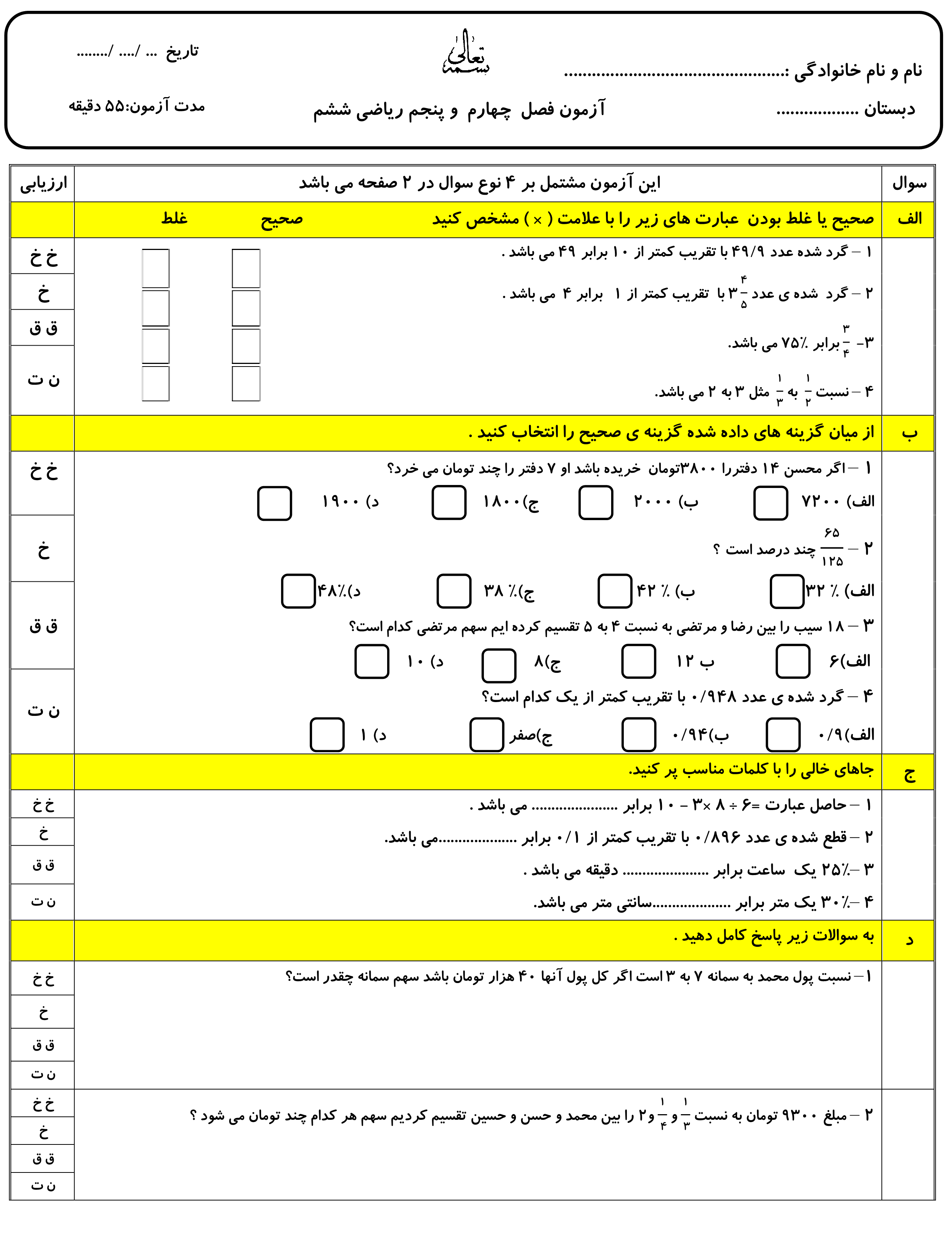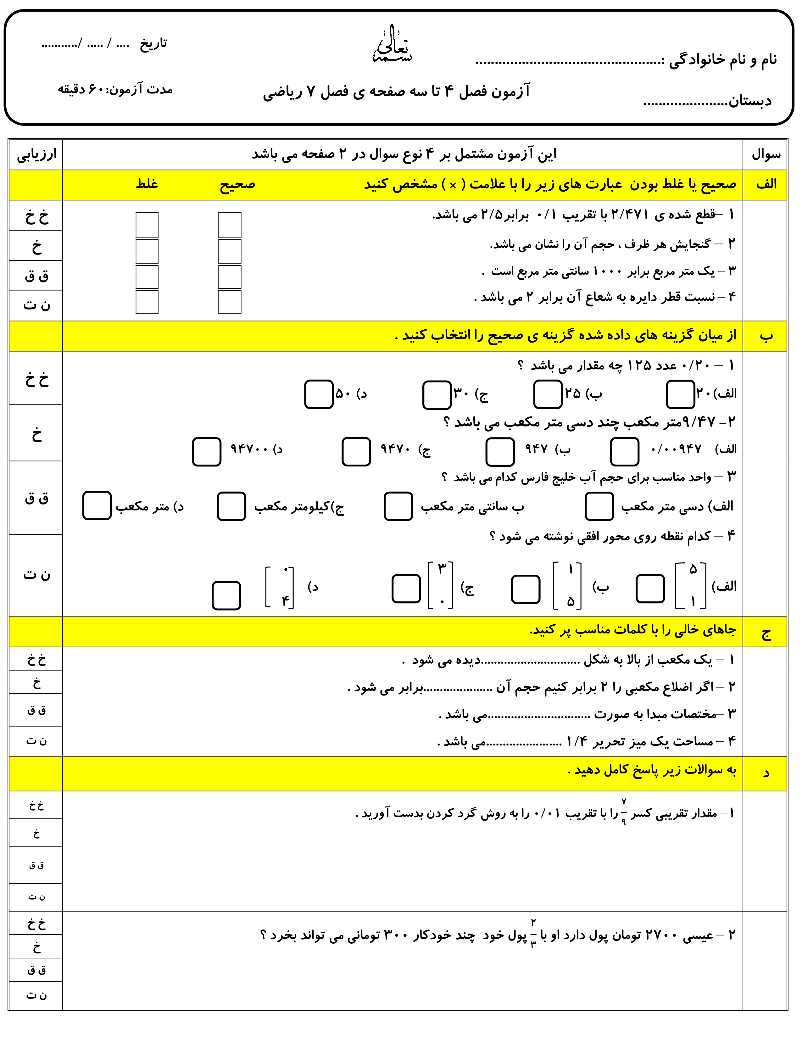آزمون فصل 4 تا 4 صفحه ی فصل 7 ریاضی ششم